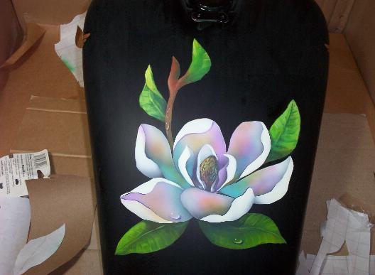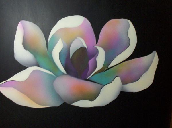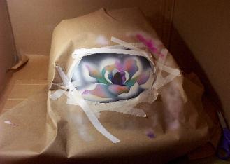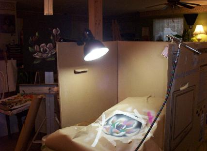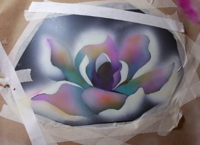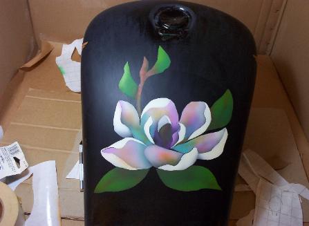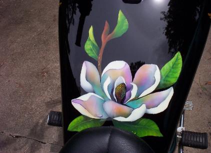 | For me, all painting is somewhat messy. Airbrushing has particular preparations and safety measures. I use masking film that you can order or purchase from art supply stores. Texas Art is a good place to search first in the Houston area. A special stretchy masking film is great for automotive projects. First, I draw or paint my original painting, then trace it off on tracing paper. I like to buy the huge rolls of tracing paper from the drafting sections of office or art supply stores. I usually use Auto-Air Colors for automotive painting, and Createx for regular airbrush work. I've also used inks for some paper art work. In the next picture, you can observe my set up. I've recycled a discarded cardboard box for my airbrush area--and especially handy to protect other parts of my studio. Do you see my original pastel sketch on the easel in the background? Also, my oil palette is in view--but not used for this project. (Cautionary note: never use fine art oil paints on automotive airbrush paintings). Also, the rest of the motorcycle gas tank is masked off with paper to prevent any over spray. I cut the pieces of the flower out of the masking paper--one section at a time with a hobby cutting blade, airbrushed the section, let it dry for a moment, then replaced the masking film. Below is a close up of the flower with several layers of spray--no branches, leaves, or detail. |
